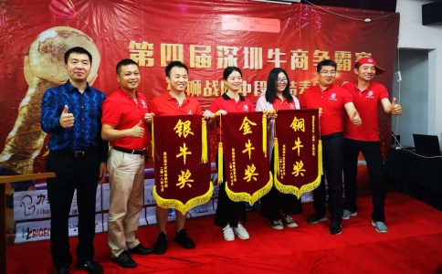 深圳市單仁資訊有限公司總經理楊光、深圳市牛商爭霸賽總司令石華、雄獅戰隊司令劉海峰、政委王小峰和金、銀、銅牛獎企業合影!