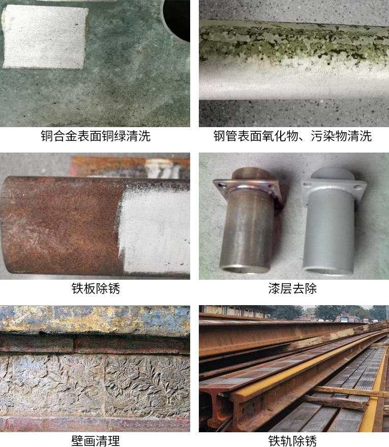 激光清洗具有無(wú)研磨、非接觸特點(diǎn),不但可以用來(lái)清洗有機(jī)的污染物,也可以用來(lái)清洗無(wú)機(jī)物,包括金屬的銹蝕、金屬微粒、灰塵等,應(yīng)用功效包括:除銹、脫漆、去油污、文物修復(fù)、除膠、去涂層、去鍍層。適用于銹層、漆層較厚,油污較深的情況下清潔,以及表面粗糙化、焊縫清潔等工藝環(huán)節(jié),效率極高。應(yīng)用行業(yè):航空、船舶、文物保護(hù)、汽車周邊、食品行業(yè)、軌道、橡膠模具、其他。