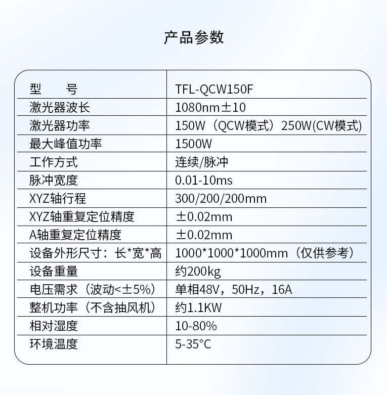 | 激光器功率 | 150W(QCW模式)250W(CW模式) |
